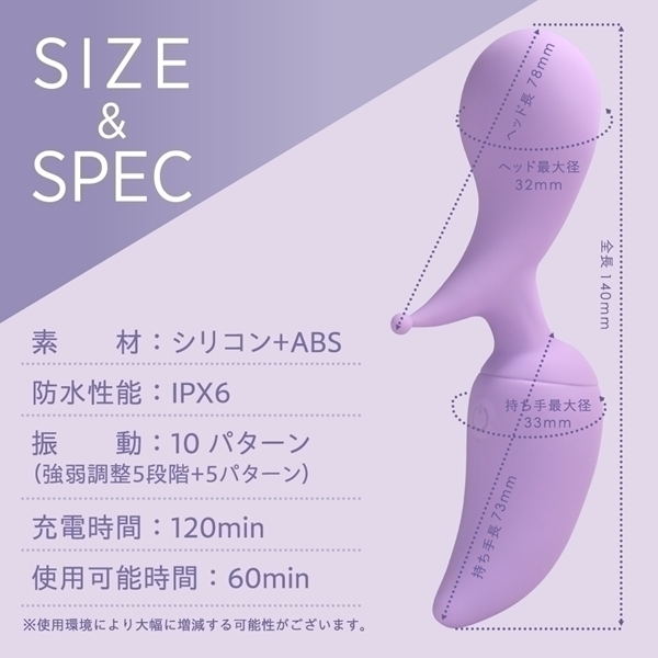 ![]() ピンポイント刺激とズンズン響く電マ刺激の両方を楽しめる勾玉型デンマです♪2WAYヘッド仕様で、ネック部分に角度をつけた設計によりセルフケアにも最適!高品質な静音×高速振動モーターを搭載し、細かい5段階の強弱調整が可能です♪さらに実用性の高い5つの振動パターンも加わり、合計10パターンのバリエーションを楽しめます!オールシリコンボディで、しっとりとやさしい肌ざわりがストレスフリーな使用感を演出♪約120分の充電で、最大60分の連続使用が可能です!(使用環境により変動します!)IPX6相当の防水設計で、水洗いできるため清潔に保てます♪毎日のリラックスタイムをサポートする、使いやすさにこだわったアイテムです!