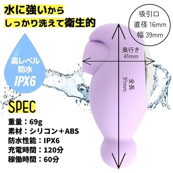 ![]() 吸引と振動のダブル刺激を同時に楽しめるコンパクトグッズです♪吸引口上部にマイクロモーターを搭載し、吸われながらブルブルとした振動が心地よい刺激を演出!吸引は強弱3段階と4種類のリズムパターン、振動は5段階の強弱調整と7つのリズムパターンを搭載しています♪それぞれを自由に組み合わせて、自分好みのパターンを楽しめます!吸引口は直径16mm設計で真空刺激がしっかり伝わる仕様です♪本体は全長10cm以下のコンパクト設計、重さもわずか69gで持ちやすく手が疲れにくいのも魅力!(使用環境により使用時間は変動します!)静音設計+IPX6相当の防水仕様で、使用後もしっかり洗えて清潔に保てます♪肌ざわりの良いシリコンボディで快適な使い心地を追求しました!