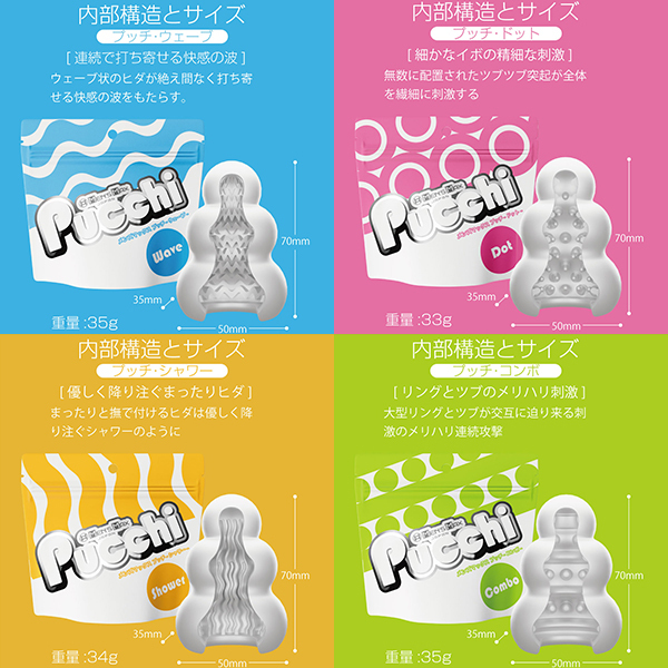 ポケットサイズのローション不要ホールプッチシリーズが生まれ変わって新登場。 軟性素材から内部の構造、パッケージ、全てが新しくなりました。 デコボコ感、さらにクッキリ。 今回新たに導入した「HD(High Definition)成形」で突起のデコボコ感がさらにクッキリになりました。 突起に触れたときの粒立ちが違います。 弾力感、さらにモッチリ。 「HD 成形」により軟性樹脂の弾力性も向上。 さらにモッチモチに、しなやかな素材になりました。 内部構造も、さらにハッキリ。 オリジナルシリーズ、スイーツシリーズ計8種類の内部構造をより精密な造形にリニューアル。 「HD 成形」とあいまってデコボコ感がよりハッキリわかる構造になりました。 生産工場を一新。 新型プッチシリーズは日本国内に新設した工場から生産。 最新の設備と厳密な品質管理で一つ一つ丁寧に作ります。 ローション不要、必要なのは水だけ。 ローション不要軟性素材「プラスウェッチ」水分が付着すると潤い成分が反応、ねっとりした潤いに包まれます。 <ウェーブ内部構造>「連続で打ち寄せる快感の波」ウェーブ状のヒダが絶え間なく打ち寄せる快感の波をもたらす<ドット内部構造>「細かなイボの精細な刺激」無数に配置されたツブツブ突起が全体を繊細に刺激する<シャワー内部構造>「優しく降り注ぐまったりヒダ」まったりと撫で付けるヒダは優しく降り注ぐシャワーのように<コンボ内部構造>「リングとツブのメリハリ刺激」大型リングとツブが交互に迫り来る刺激のメリハリ連続攻撃 ![]() --![]() Variety Set![]() パッケージ:8.0×13.0×6.5cm 本体:全長7.0×直径5.0cm![]() [ BACK ]