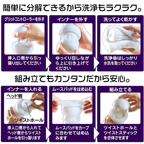 右と左のひねる方向で内部構造も変化する!お好みのひねり具合で吸着感をコントロール!挿入口のキャップを外しローションを入れて挿入。 グリットコントローラーを右に左にねじって刺激の変化を体感せよ。 インナーは丸洗い可能。 各パーツを取り外し、洗浄・乾燥が終わったら組立てて再び使用可能。 アウターケースは耐久性に優れ表面のマット仕上げとフォルムで安心のグリップ感。 インナーは約250gで単体のみでの使用も可能なずっしりサイズ。 ポケットローション(7ml)付属。 グリットコントローラーに付いたスプリングボールとギアカルーセルがかみ合いスムーズな操作性を実現。 グリットコントローラーは右にも左にも回せます、右と左のひねる方向で内部構造も変化する!お好みのひねり具合で吸着感をコントロール!<内部構造>@エッグワーム プルプルの卵型ギミックAインチワーム 小型ワームの巣窟を模したギミックBファットワーム 大型ワームギミックによる悪魔の絡みつき ![]() --![]() WORM TYPE(ワームタイプ)![]() 本体:18.4×8.7cm 重量:387g![]() [ BACK ]