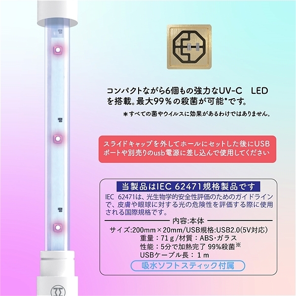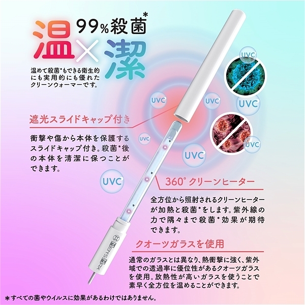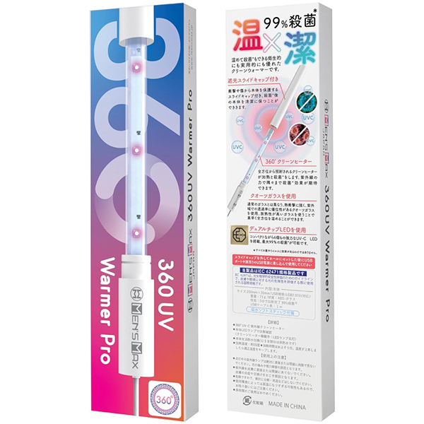 3分で急速加熱、UVランプで360°殺菌、20センチのロングサイズ、乾燥に便利な吸水ソフト、ティック付属、USBケーブル長さ1m。 99.9%除菌、除菌に最も効果的な波長275nmのUVC紫外線ランプを6個搭載し、USB電源を入れるだけで99.9%除菌ができる。 気になるウイルスや、細菌をしっかり除菌してくれて、お気に入りのホール内を360度清潔に保てます。 ■使い方手順@本体キャップを外すAウォーマーをホールにセットするBUSB電源をセットして加熱と、除菌を開始します<ロングサイズ>本体サイズは20cmで大型ホールの使用も安心です<液体に強い 生活防水仕様>材質はABS・ガラスなので安心の生活防水仕様。 丸洗いができるので清潔に使用できます。 <ウォーマー機能>加熱時間およそ5分で約55度まで上がり加熱完了。 ※USB部分は非防水です。 ![]() --![]() --