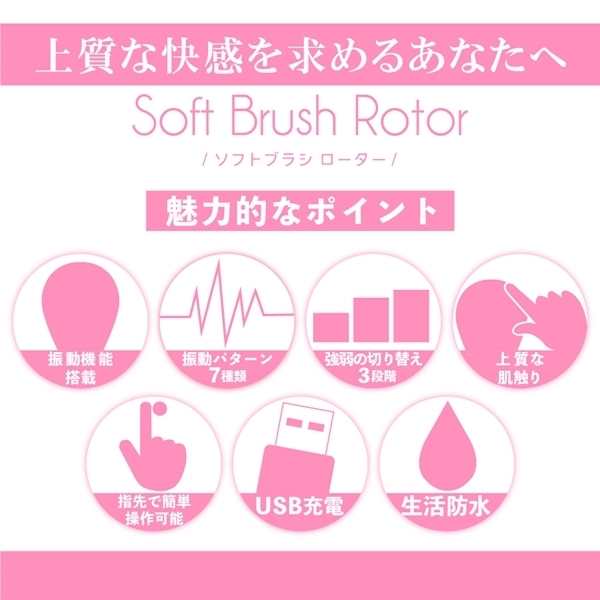 強い刺激が苦手な方でも安心。 MOTLABに女性向けグッズブランド、ハートラインが誕生。 Soft Brush Rotorは柔かなブラシ状の先端が細かく震え優しい刺激を与えます。 7種の振動パターンに加え、強弱を3段階で変更できるので、自分に合った刺激を調節できます。 先端部分は吸盤で接続されているので、取り外しや角度の調整が可能。 ワンボタンで操作可能なシンプル仕様です。 充電式なので使う場所を選びません。 生活防水なので安心して使え、使用後は洗浄し清潔に保てます。 ![]() --![]() --