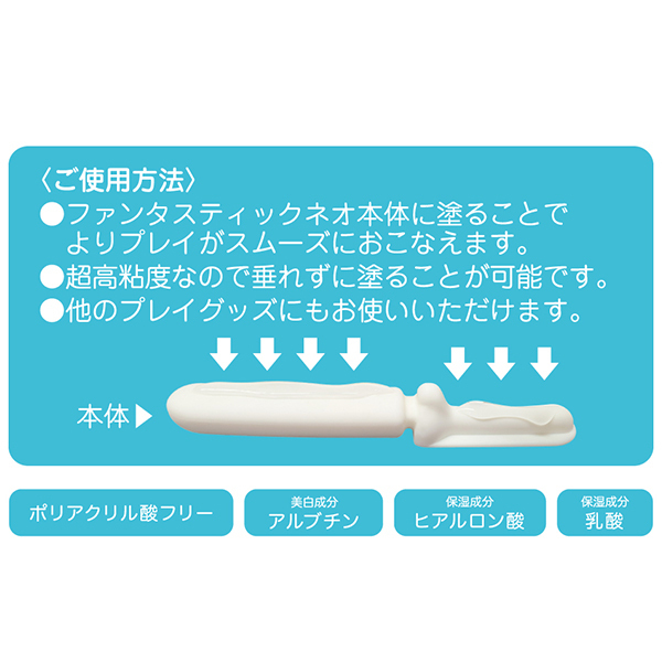 あの人気商品「ファンタスティックネオ専用ローションで、膣に入っても安全な化粧品レベルの安全性が特徴!チューブタイプなので適量を取り出しやすく、美白成分アルブチン、保湿成分ヒアルロン酸、乳酸が入った化粧品レベルの仕上がりとなっております♪歯磨き粉のような硬さ超高粘度!スティックに垂れる事なく塗る事ができて使いやすい♪ファンタスティックネオだけじゃなくバイブやローターなど他のグッズにもお使いいただけます。 ![]() --![]() 150mk![]() ボトル:18.0×6.0×3.5cm![]() [ BACK ]