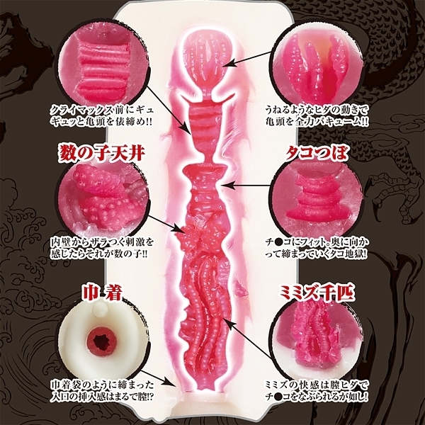 内部に数か所の締まる部分が存在する。 それが俵締め!Eイソギンチャクうねるようなヒダの動きと吸引する名器がイソギンチャクです!この6つの名器が一つに合体した!それが超越名器なのです!名器という名器を超越した最強名器がここに誕生!全ての名器が合体した最終名器システム!これこそが日本が誇る名器オナホです! ![]() --![]() --