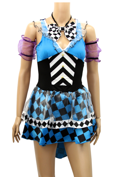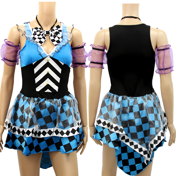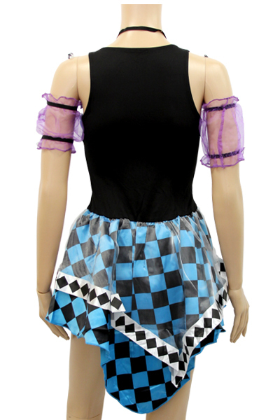 ブルーをベースに紫×黒とハーリキンチェック柄を随所にちりばめたオシャレでポップなミニドレス。 ハーリキンチェック柄で軽やかなスカートをお探しの方にもぴったり♪ドレスは柔らかな素材を使用したノースリーブのワンピースタイプ!後ろ丈が長いハイロウタイプのスカートは、シースルーのオーガンジー生地を重ねたレイヤードデザイン。 さらに、マッドハッターの特徴でもある「10/6」ミニハットと首リボン、シースルーのアームバンドもセット!絶妙な色使いで魅せる女性版マッドハッター風のハロウィンコスチュームです。 スカート部分にもハーリキンチェック柄で拘りたい方や、流行り廃りの無いシンプルなデザインで楽しめるかわいいタイプのチェック柄に目がない方にもお勧めです♪。 ※セット内容以外は付属しておりません。 ![]() --![]() o−250![]() Mサイズ(平置き):B35〜44cm・W31〜40cm・Hフリー 丈:前身頃67cm/後ろ身頃89cm セット内容:ワンピース・ミニハット・リボン(ゴム)・アームバンド×2 ![]() [ BACK ]