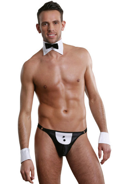 ●黒×白のシックなバイカラー仕様●タキシードデザインのGストリング●蝶ネクタイが可愛いアクセントに●付け襟・付けカフスもセット。 おもてなしやエスコートはおまかせあれ!インナーなのにフォーマルな雰囲気が演出できる男性用ランジェリー。 特別な夜や記念日などにぜひどうぞ。 ![]() --![]() 8061![]() フリーサイズ パッケージ:28.0×18.0×2.0cm セット内容:パンティ(Gストリング)、付け襟、ネクタイ、リストバンド ![]() [ BACK ]