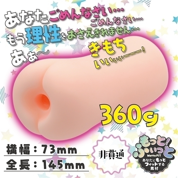 360gの本体はその肉厚でググっと締め付け、密着度も包容感もたっぷりです。 適度な弾力と密着感の独自素材「もっとふぃっと」を採用しています。 ![]() --![]() --