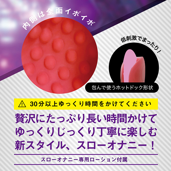 スローオナニー専用オナホール「ズリセン」!あなたは、「スローオナニー」という言葉を知っていますか?贅沢にたっぷり長い時間をかけて、ゆっくりじっくり丁寧にプレイを楽しむ、それがスローオナニー。 「ズリセン」は、そんな新しいプレイスタイルのために生まれたオナホールです。 挟み込むホットドッグ形状と、まったり刺激とで、スローオナニーをサポートします。 貴男をパックリと挟んで包むホットドッグのパンズような形状が特徴的です。 通常のオナホールにある挿入行為が不要で挟むんでコスるだけで楽しめるのでビンビン状態でなくても使用可能。 半ビン状態から優しいアプローチで、ゆっくりと気分を高めることが出来るのです。 長い時間を楽しめるよう、まったりとした刺激も特徴的。 最初は優しくスリスリ、盛り上がってきたら裏をズルズル、さらに高まってきたら頭をグリグリとまるで磨き上げるようにじっくり楽しめます。 焦らすようにジワジワと快感を貯め込むことでフィニッシュ快感は遥かな高みに到達するはず。 すぐにフィニッシュを求めず、そこに至るまでの刺激を楽しみ続け、より深い快感を目指す贅沢な流儀。 それが新しいスタイル、スローオナニーなのです。 強い刺激やビンビン持続も必要ないので、「早さ」や「タフさ」のトレーニングにも!?「イボ」は、大きなイボイボ突起がびっしり配置されたデコボコ快感。 弾力たっぷりな肉感素材。 クリアカラーに包まれたビビッドなレッドカラーが絶妙な高級感を演出。 手コキと相性ぴったりなツブツブのまったり刺激をお楽しみください。 ![]() --![]() イボ![]() パッケージ:15.0×7.5×7.5cm 本体:13.0×6.6cm 重量:240g![]() [ BACK ]