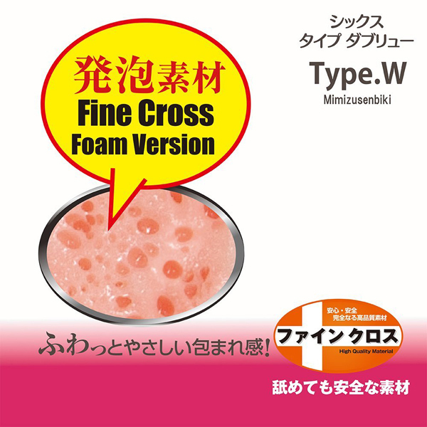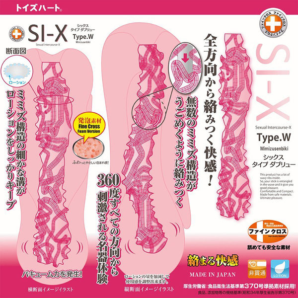 ●シックス・タイプ「W」ver●ふわっと優しく包み込む発泡素材を採用●内部:360℃配置した無数のミミズ千匹構造●細かな溝がローションをしっかりキャッチ●バキューム力も抜群●日本製・ローション付き。 挿入直後から無数の触手がどこまでも絡みついてくる刺激たっぷりのオナホールです。 ![]() --![]() --