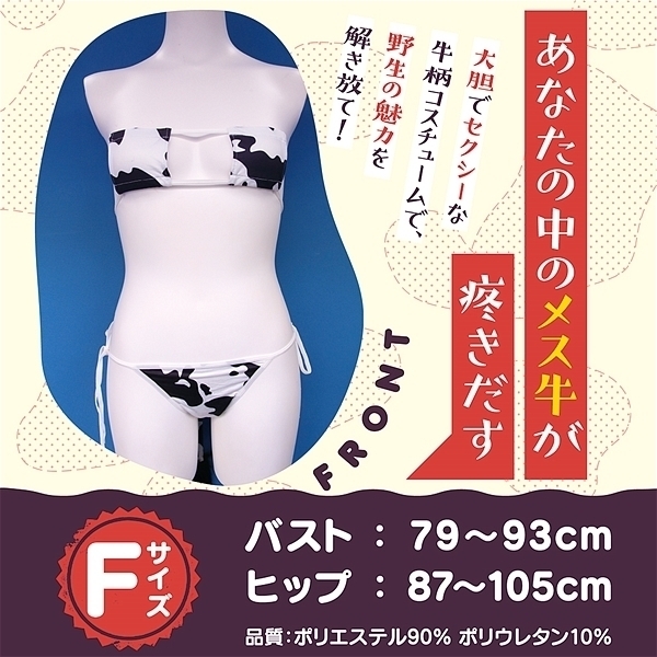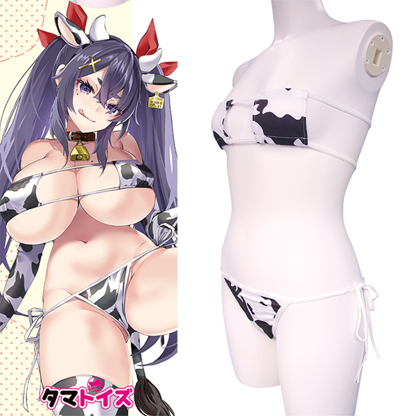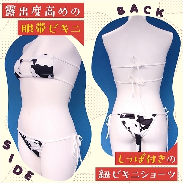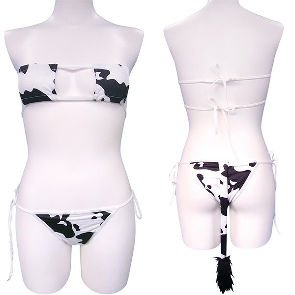![]() 大胆でセクシーな牛柄コスチュームで野生の魅力を解き放て!あなたの中のメス牛が疼きだす、露出度高めの眼帯ビキニとしっぽ付きの紐ビキニショーツ。