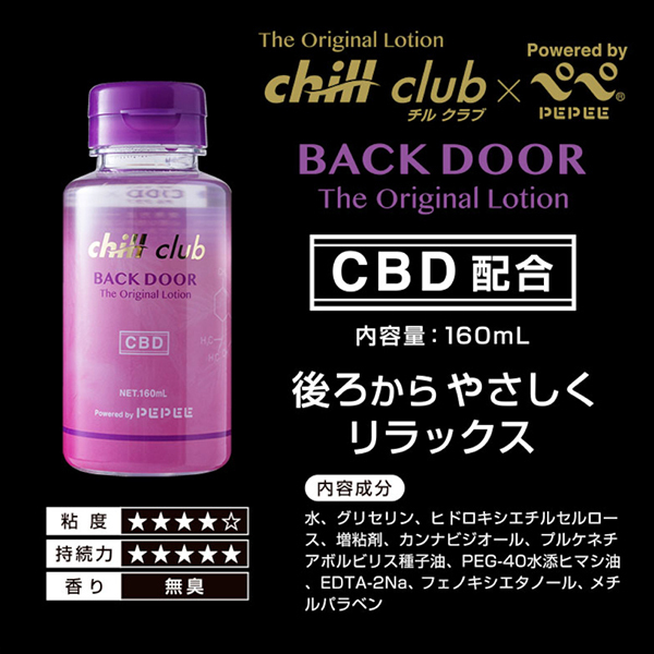 大人気ブランド「ぺぺ」とコラボレーションした安心安全の日本製ローション♪BACKDOORはバックプレイに最適な使用感を持っています。 最適な潤滑力に粘度と持続力!バック特化型の使用感でゆったりとリラックスしたバックプレイをお楽しみいただけます。 色は無色透明で味・匂いもありません。 本製品はしっかりとした生産管理の元、ヴァージンキャップを採用。 安心と安全をお約束致します♪ ※CBDとは大麻草などに含まれる成分のひとつで、そのリラックス感が人気となり、欧米をはじめ世界で話題となっています。 精神へ与える作用や中毒性がないことで知られており、医療や健康・美容業界から注目を集める成分です。 CBDは、大麻草の成熟した茎および種子から採取された成分で、いわゆる違法大麻と違って、ハイになったり酩酊状態を引き起こす効果はないので、合法になっています。 <成分>水、グリセリン、ヒドロキシエチルセルロース、増粘剤、カンナビジオール、プルケネチアボルビリス種子油、PEG-40水添ヒマシ油、EDTA-2Na、フェノキシエタノール、メチルパラベン ![]() --![]() BACKDOOR 160ml![]() ボトル:11.5×5.1cm![]() [ BACK ]