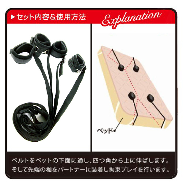 ベルトをベッドの下に通して上下から出し、手枷と足枷をパートナーに装着したら完成!ベッドの脚に繋がなくても良いので、マットレスタイプでも使用可能です。 枷はマジックテープ式でサイズ調節も楽々!肌に当たる部分はソフトなウレタン素材を使用し、お肌を痛める心配もありません。 エロ絵師、尾髭丹氏の肉感的なパッケージにも注目です。 ※設置場所の状態を確認してからご使用ください。 ![]() --![]() ベッド拘束![]() パッケージ:13.5×19.0×7.0cm![]() [ BACK ]