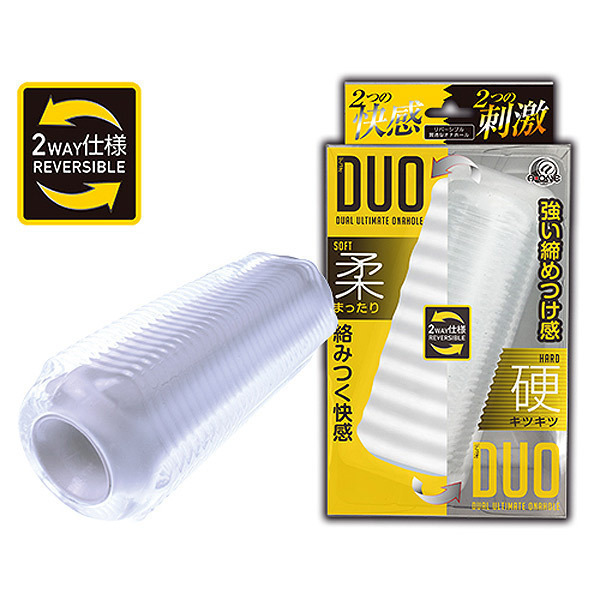 ![]() ソフトとハードの刺激をこれ一つで♪ひっくり返して使う両面仕様のリバーシブルオナホール「DUO(デュオ)」。