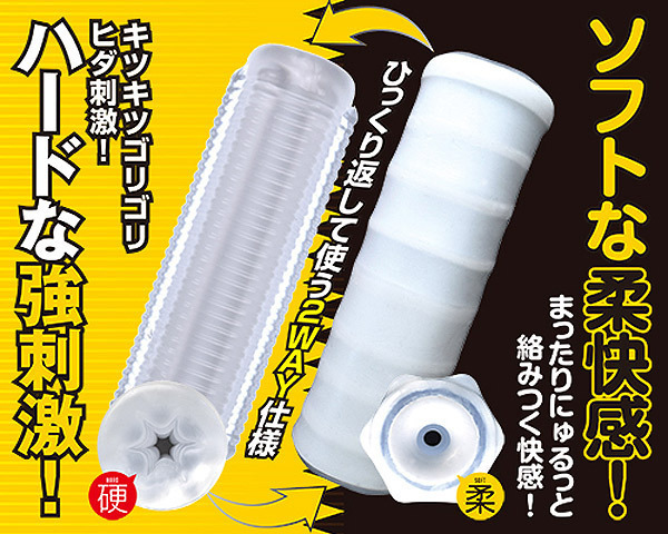 ●裏返して使うリバーシブルタイプ●ハード:クリア素材の細ヒダ構造●キツキツなゴリヒダの強刺激快感●ソフト:ふわふわ白素材の柔構造●にゅるっとまったり絡みつく快感●裏返しやすく洗浄しやすい貫通型。 気分に合わせて使い分け♪表と裏で異なる挿入感を楽しめる2WAY仕様のオナホール。 にゅるっと絡みつくソフトな快感と、ゴリヒダ刺激のハードな快感をお楽しみ下さい。 ![]() --![]() --