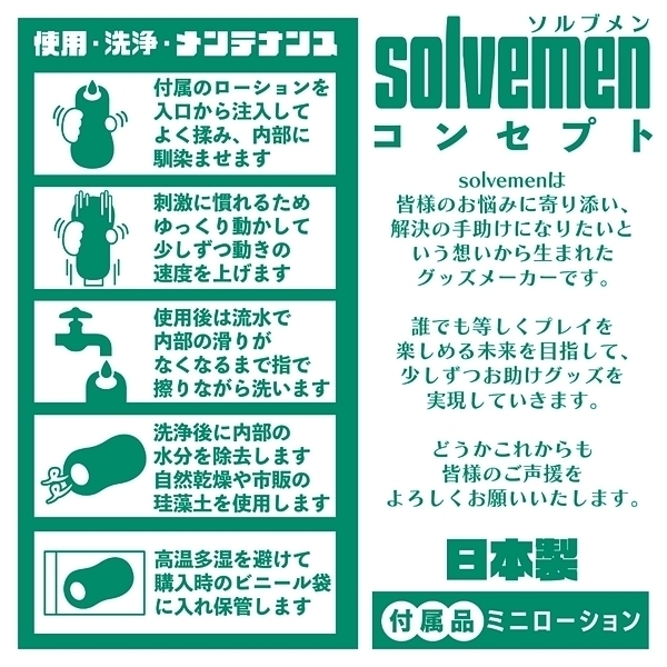 「今日はイボで刺激的に」「今日はヒダでやさしく」同じものを使い続けたいときもあれば、1日おきに違うものを使いたいときもある。 そんな気まぐれに全力で応えたいです。 それがソルブメンの生まれた意味だと思いませんか?今回のテーマは「めっちゃイボ」となります。 敢えてイボだけにしなかった意図をお教えしましょう。 ヒダのなかに確かな存在感、イボは本当にイボ。 それは間違いないのです。 しかし敢えてヒダの群れにイボを配置する事でしか生まれない、極上の快感ハーモニーがあることをどうしても感じて欲しかったのです。 あなたはオナホ選びに悩む必要はなくなります。 あなたのためにソルブメンがいるのです。 安心安全の日本製で繰り返し何度でも利用が可能です。 ![]() --![]() --