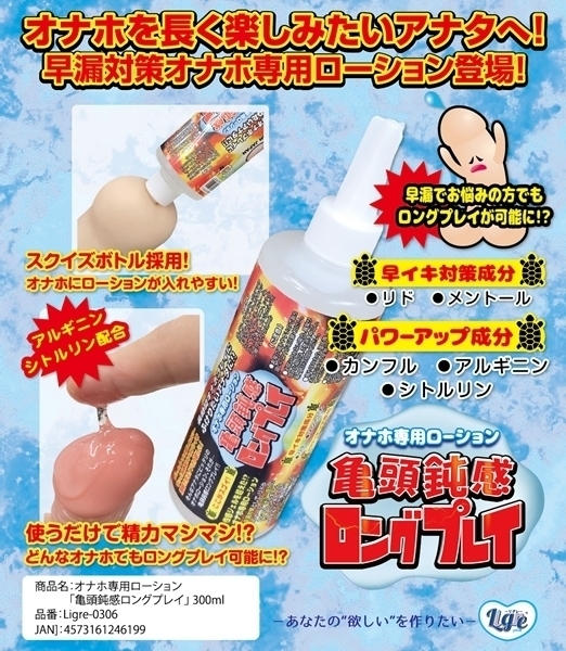 ![]() じっくり楽しみたい方のために開発された専用ローションです♪メントールやカンフルなどの成分を配合し、ひんやりとした使い心地を演出します!アルギニンやシトルリンなどのサポート成分も加え、快適な使用感を追求しました♪粘度はほどよく、さまざまなタイプのオナホールと相性よく使える水溶性タイプです!スクイーズ式ボトルを採用しているため、使いたい分だけを片手で簡単に注ぐことができます♪扱いやすく、清潔に使用できる点も嬉しいポイント!持久力に不安がある方や、プレイ時間を長く楽しみたい方にもおすすめです♪毎日のセルフケアをもっと快適に、もっと自分らしく楽しみたい方にぴったりの一本!シンプルなボトルデザインで保管や持ち運びにも便利です♪充実したひとときのために、ぜひご活用ください!