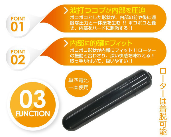 ●串団子のような高弾力ボディ●徐々に太くなる連続コブ突起●適度な圧力を生むポコポコ刺激●扱いやすいグリップリング付き●腸全体に響き渡るローター振動●三段階の振動強弱切り替え搭載●内蔵ローターは取り外し可能。 ポコポコ形状が内部にフィット!前後に適度な圧力と一体感を与えて下半身を震撼させる電動アナルグッズ。 スリムなスティックタイプながら、連続コブでしっかりとした挿入感に!さらに、ローターの振動との相乗効果でより深い快感を味わえる次世代型のスティックバイブです。 ※電池周囲の保護用シートは外さないでください。 ![]() --![]() キュー![]() パッケージ:18.5×13.0×4.0cm 本体:全長約15.5cm 挿入部約10.0×3.5cm 電池:単四電池×1本使用![]() [ BACK ]