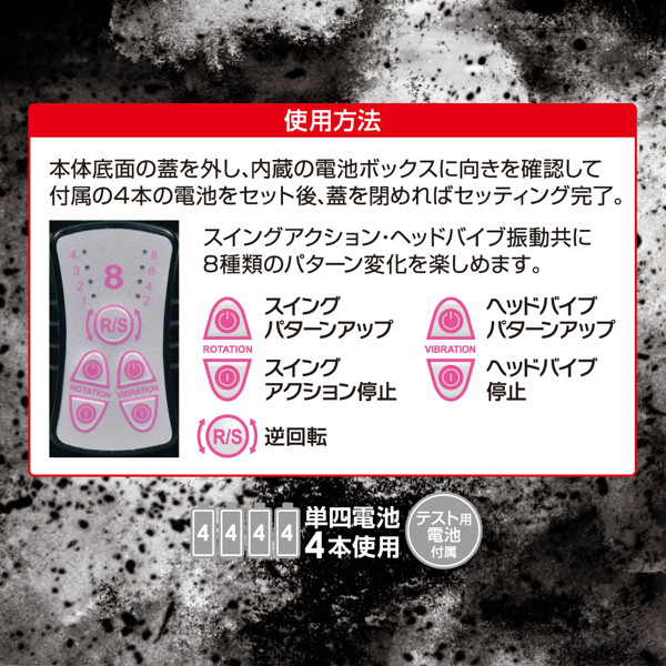 8種類の振動&スイングと刺激の変化をもたらすリバース機能など多彩なアクション搭載!挿入可能長153mmのストレートボディが内部をかき回し、ヘッドバイブでGスポを徹底的に刺激する♪止まらぬ快感に病みつきになること間違いなし!滑らかで柔らかな特殊ラバー素材使用。 単4電池×4本使用 ![]() クリアブラック![]() ハード![]() パッケージ:23.2×7.5×4.0cm 本体:21.7×3.4cm 重量:134g 電池:単四電池×4本使用![]() [ BACK ]