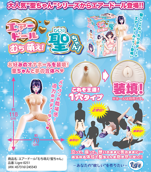 ![]() 超リアルエアドール「むち萌え!聖ちゃん」の登場です!匂い系グッズで人気の、聖(ひじり)ちゃんがエアドールになりました♪むちむちのボディで恥ずかしそうな聖ちゃんの笑顔がたまらない!顔全体がしっかりと違和感なく収まっていて凛々しいエアードールへと仕上がっています♪空気を注入すると後ろ手にM字開脚したポーズになり、王道の1穴タイプでお好きなオナホを装填したら、いざ聖ちゃんと合体へ!体位は正常位からバック、さらには斜めに交わる事も可能でホールは小型から中型ぐらいまでなら装着可能♪肌はビニールっぽくない触り心地で少しマットな感じもグッド!蕩けそうな恥じらいフェイの可愛い聖ちゃんをたっぷりと体感してください♪浮き輪を作っている工場制作なので、頑丈で安心ですよ!