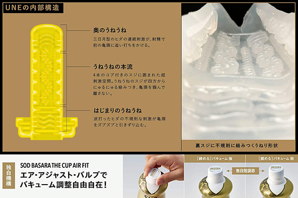 無段階に空気調整ができる新機構エアアジャストバルブを搭載した「SOD BASARA」シリーズ!奥行12.5cmと奥突きできる独自設計で、素材には包み込まれるように気持ちいい最高級ウレタン採用。 挿入部周辺のボリューミークッションで下腹部まで心地良い◎重量156g ![]() --![]() AIR FIT UNE![]() 本体:18.7×7.4cm 重量:156g![]() [ BACK ]