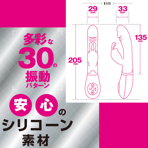 大きすぎず小さすぎずなちょうど良いサイズ感で2点責めの王道タイプ!単四電池2本で駆動するバイブで30種類もの豊富なパターンで飽きずに振動刺激を体感できます♪挿入シャフトは先端が亀頭のような形状で素材にはシリコンを採用!挿入フィーリングも悪くなく、モーター内蔵の子機はウサ耳タイプとなっておりますのでクリへの刺激もダイレクトに楽しめます♪ ![]() --![]() --