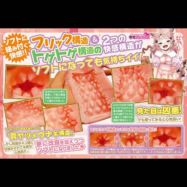 ![]() 大小山型の突起がさわさわと竿を撫でるゾクゾク感がたまらない!高刺激と思わせながらも心地よい刺激でイカせてくれる非貫通オナホ「ネコ娘プリティーエッチソフト」です♪ネコ娘の甘噛みをコンセプトに開発されたオナホで、タマトイズで人気のヤツメウナギ構造を進化させ、フワトロ系にしたことで大きめのイボのような刺激を実現!アウターはシンプルな筒型で挿入口はポチ穴♪フレキシブルな弾力感のある素材感でサイズ的にミドルサイズ!弾かれるようなフリック構造の内部とびっしり配置された2種類の突起イボが、絡みつくような快感を存分に味わわせてくれます♪●メーカー型番:TMPR-040