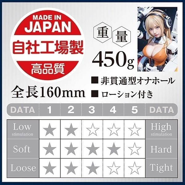 「AIが考えた内部構造」+「下部二層」の極上名器。 AIが作る理想的なオナホールと理想的な女性イラスト、上は柔らか下は固めの「ソフト&ハードの片面二層」採用。 空間を敢えて広くする事でバキューム効果を発生させる設計。 弾力のあるフレキシブルスキン使用し高弾力・高伸縮、匂い控えめ。 ![]() --![]() No.3![]() 非貫通型 パッケージ:21.0×14.5×8.5cm 本体:16.0×7.0×6.5cm 重量:450g![]() [ BACK ]