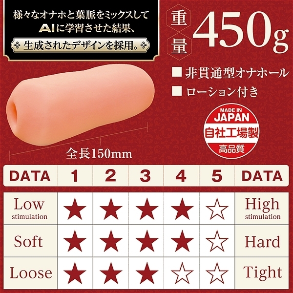 「AIが考えた内部構造」+ふわ柔素材が奏でる心地よさ。 弾力のあるフレキシブルスキン使用高弾力・高伸縮素材で匂い控えめ安心の日本製 ※裏返しにすると破損の恐れがあります。 ●メーカー型番:TMAIー05 ![]() --![]() No.5![]() 非貫通型 パッケージ:21.0×14.5×8.5cm 本体:16.0×7.0cm 重量:450g![]() [ BACK ]