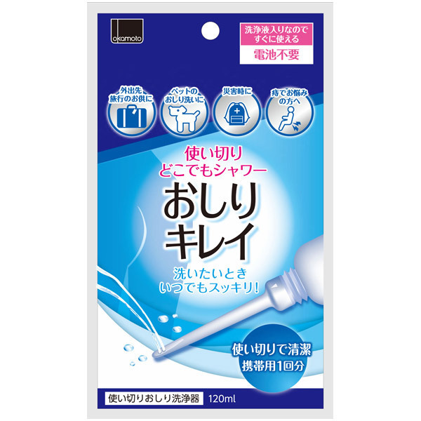 ●大手オカモト社開発の日本製●清潔で安心な使い切りタイプ(携帯用1回分)●水圧自在なソフトボトル採用●無理なく届く8.5cmノズル●国内採取の精製水120ml入りで即使用可。 旅行などの外出時に温水洗浄機能の無いトイレに出くわしても、すぐさま使える洗浄液入り!水の補充も不要、もちろん電池も必要ありません。 外出先で温水便座を使えない時だけでなく、痔でお悩みの方、さらにはペット用として…などなど、様々なシーンでお使い頂けるおしり洗浄器です。 ![]() --![]() 120ml![]() パッケージ:18.5×11.0×5.6cm 本体:全長19.0cm ノズル長約8.5cm![]() [ BACK ]