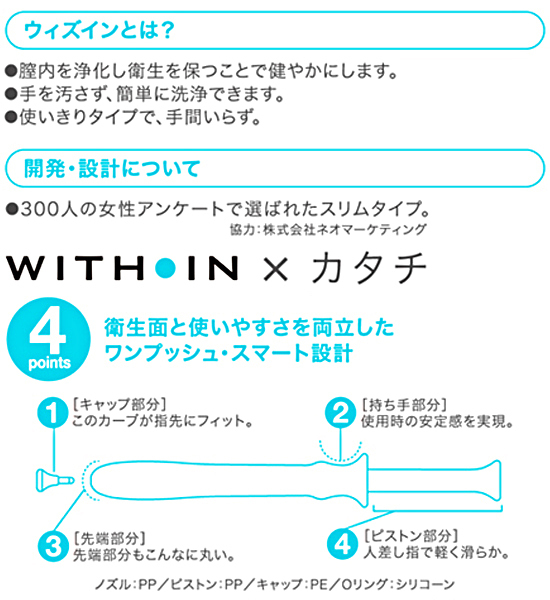 挿入しやすいスリムタイプで、衛生的な一回使い切りタイプ♪膣内に挿入してワンプッシュすれば手を汚さず簡単に洗浄できる!使い心地はとってもナチュラルで、初めての方でも安心してお使いいただけます。 無色透明&無味無臭 ![]() --![]() 3本入![]() 精製水、グリセリン、ヒドロキシエチルセルロース、プロパンジオール、乳酸、クエン酸ナトリウム、ヒドロキシプロピルシクロデキストリン、ブチルカルバミン酸ヨウ化プロピニル、EDTA−2Na、ヒアルロン酸Na、コンドロイチン硫酸Na![]() [ BACK ]