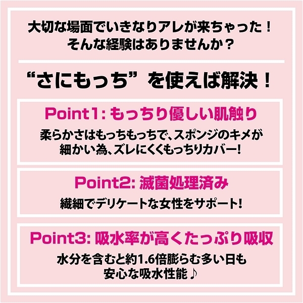 柔らかくもっちりとした感触の新素材。 吸水性が抜群で、水を含むと約1.6倍膨らみます。 さにもっちの柔らかさはもっちもっちで、スポンジのキメが細かい為、ズレにくくもっちりカバー。 繊細でデリケートな女性をサポート。 ●もっちり優しい肌触り●滅菌処理済み●吸水率が高くたっぷり吸収材質:ポリウレタン(親水性) ※食べ物ではないので口に入れないでください、小さなお子様が誤って口にしないよう注意してください、長時間の利用は雑菌が繁殖する恐れがありますので、入れっぱなしにはしないようご注意ください、取り出しにくい場合はシャワーや精製水で商品本体を膨らませると取り出しやすくなります。 ![]() --![]() 5個入![]() パッケージ7.5cm×4.5cm×2.5cm 本体:4.5×3.0×1.5cm![]() [ BACK ]