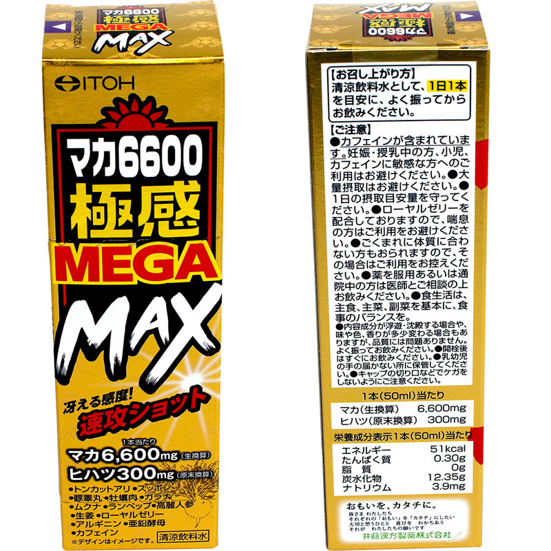 マカ6600mgとヒハツ300mgが入った製品。 カフェインが入っているので敏感な方へのご利用はお避け下さい。 ![]() --![]() 50ml![]() パッケージ:15.3×4.6×4.4cm![]() [ BACK ]