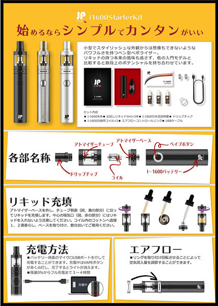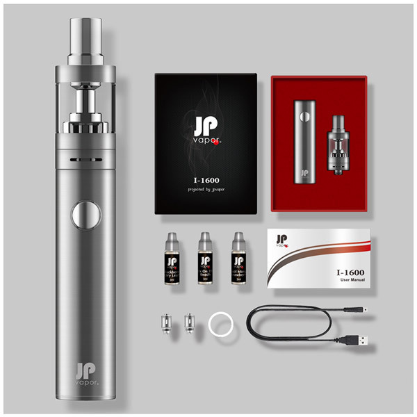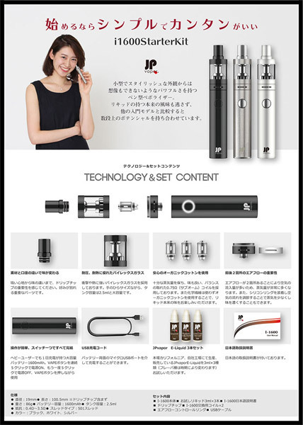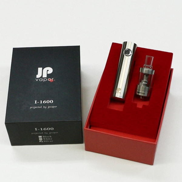 ![]() 快適なVAPE(ベイプ)ライフをすぐに始められる特製BOX入りのフルセット!電子タバコのペン型ヴェポライザー「JPvapor I-1600 スターターキット シルバー」。