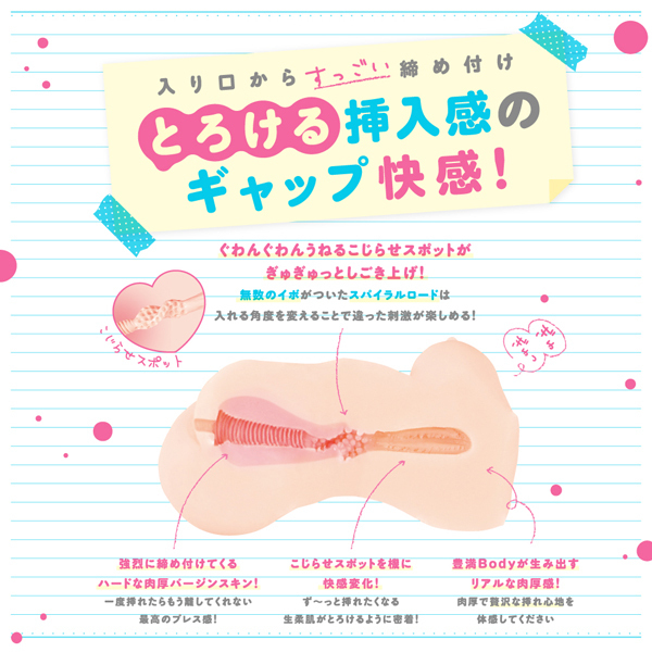 ぐわんぐわんうねるこじらせスポット搭載!ずっしり肉厚540gの豊満Bodyはとっても贅沢な挿れ心地!強烈に締め付けるハードなバージンスキンの入口から、ずーと挿れたくなるようなとろとろソフト素材への快感の変化を楽しめます!真ん中に配置されたこじらせスポットは、ピストンのたびにぎゅぎゅっとしごき上げ!締め付け・こじらせ・生柔肌の3つの快感。 贅沢な挿れ心地を体感してください。 ![]() --![]() --