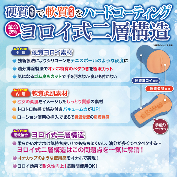 」とお嘆きのあなたに、ヨロイ×乙女の柔肌!硬質素材(外層)で軟質素材(内層)をハードコーティング!鎧乙女オトメイルは硬軟素材が接合した革命技術「ヨロイ式二層構造」の非貫通オナホールです。 外層は独自技術により、オナホ特有の「ベタつき」や「ゴム臭」を極限カットし、テニスボールのような硬度に生成しました。 そして、硬いヨロイに覆われた内層部分は、メリハリのきいた硬度ギャップのトロトロ軟質素材。 乙女の柔肌をイメージしたしっとり質感で絡み付き、粘着質なバキューム効果を生み出します。 鎧乙女オトメイル ジャンヌ、ダルクは無尽蔵に配置された「ゴシック式イボ構造」がねっとり纏わり付く粘膜質感、べたつき、臭いを排除した硬軟素材接合のヨロイ式二層構造「鎧乙女オトメイル」を是非お試しください。 簡単お手軽なオナカップの使用感で、非貫通オナホのバキューム力を得られるオナホールです。 ![]() --![]() 麗しの白銀 騎士乙女 ジャンヌ・ダルク![]() 非貫通型 パッケージ:20.5×11.5×8.5cm 本体:16.0×8.5cm 重量:460g![]() [ BACK ]