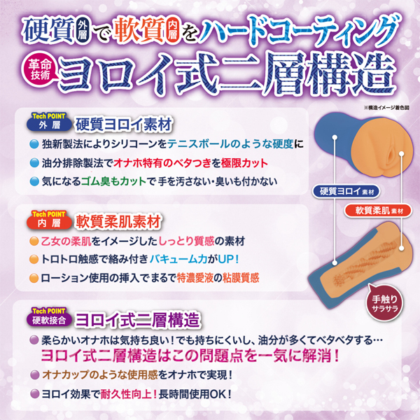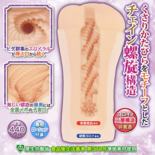 」とお嘆きのあなたに、ヨロイ×乙女の柔肌!硬質素材(外層)で軟質素材(内層)をハードコーティング!見たまんまの分かりやすい構造と刺激特性。 程よい弾力を備えたインナー素材のおかげで、表面に刻まれたヒダのジョリジョリも明瞭ですし、奥へと渦巻く内壁に吸い込まれる感覚に心地よさすら覚えます。 このスパイラル状のヒダ加工は、ペニスにシッカリと絡み付きながら、カリなどの敏感ポイントも重点的に摩擦。 ゾゾッとタテ方向になぞるような誘導も発生し、それらすべての快感が複合して襲ってくるのも特長です。 さらに強バキュームによる密着感は、こうしたハイレベルな快感の土台としても影響しており、「巴御前」と並んで単純刺激の強い、射精力に秀でたモデルに位置づけられます。 簡単お手軽なオナカップの使用感で、非貫通オナホのバキューム力を得られるオナホールです。 ![]() --![]() 闇夜に忍ぶ くノ一乙女 望月千代女![]() 非貫通型 パッケージ:20.5×11.5×8.5cm 本体:16.0×8.5×8.0cm 重量:440g![]() [ BACK ]