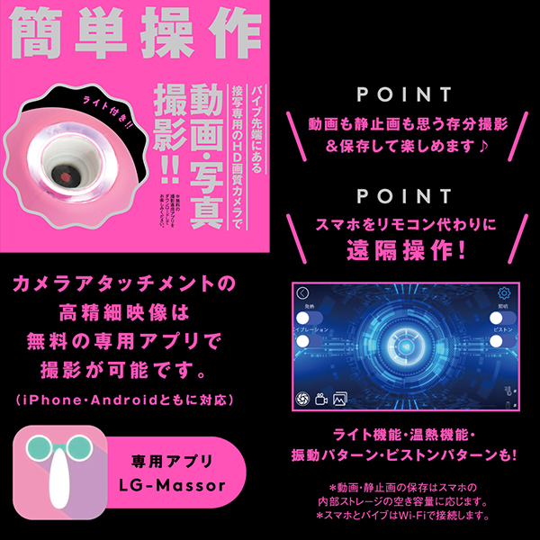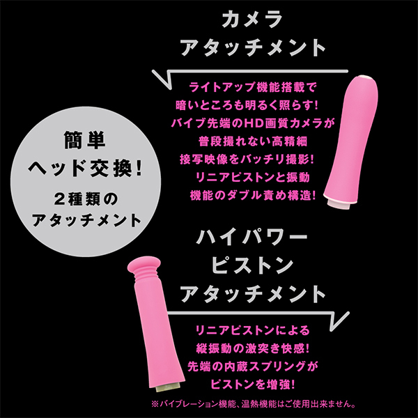 ライトアップ機能がついたアタッチメントで動画撮影や写真撮影も楽しめる!パートナーのあそこのナカを見たい欲求を満たしてくれるとともに、温感を楽しめるバイブとしても優秀なのでハイパワーピストンとリニア式のピストンアクションで極上の快感を体験できます♪お好みのリズムで感じられる9パターンのバイブ振動にリニア振動による重厚な奥突きピストン10パターン!高品質シリコン仕様でやさしい肌触りを確かめながら、温熱機能搭載で人肌感覚のぬくもりもお楽しみ頂けます。 2種類のアタッチメントで簡単ヘッド交換、飽きのない充実機能!本体は充電式で充電時間約210分。 最大連続稼働時間約70分(初期振動パターン未変更時)です。 生活防水機能付き。 付属品はアタッチメント、USBプラグ式充電コード。 ※カメラ機能は無料の撮影専用アプリをダウンロードしてお楽しみください。 ![]() --![]() --