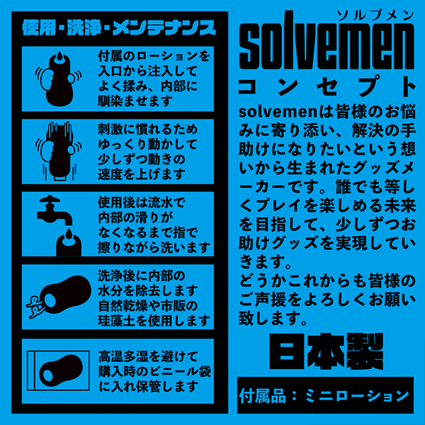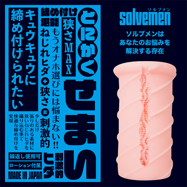 捻れたヒダ構造が特徴のホールで弾力性が高く、ハリがある素材に非貫通らしいきつきつキュウキュウとした挿れ心地を実現!硬すぎず柔らかすぎずでしっかりとした締め付けも味わえる絶妙なバランスの仕上がり♪ねじれヒダと狭さ、これらの刺激が織りなすソルブメンのコンセプト型ホールだから毎日を新鮮な気分でお楽しみ頂けます。 素材は安心安全の日本製!繰り返し何度でもご使用頂けます♪ ![]() --![]() 狭さMAX![]() 非貫通型 パッケージ:18.1×9.0×9.0cm 本体:15.0×6.5cm 重量:465g![]() [ BACK ]