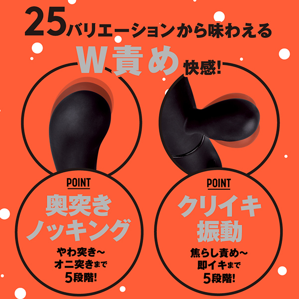 ドドドドッと揺さぶる前後運動にぐいぐい刺激する奥突きノッキング!ローターは敏感部分を焦らしながら責めあげ、クリもしっかりと振動刺激するスグレモノ♪バイブの表面はシリコンコーティングされた肌触りの良いマットな感触でバイブ初心者の方でも十分挿入可能なサイズ感。 ピストンは5段階、クリバイブの振動も5段階、焦らしから即イキまで計25通りのバリエーションから味わえるダブル責めの快感で満足必至♪電源はマグネット端子のUSB充電式でフル充電210分で連続稼働時間は約30分です。 防水はIPX5等級なので浸水は厳禁です。 水洗いは挿入部分やクリバイブまでにしておくのをおすすめします。 ![]() --![]() --