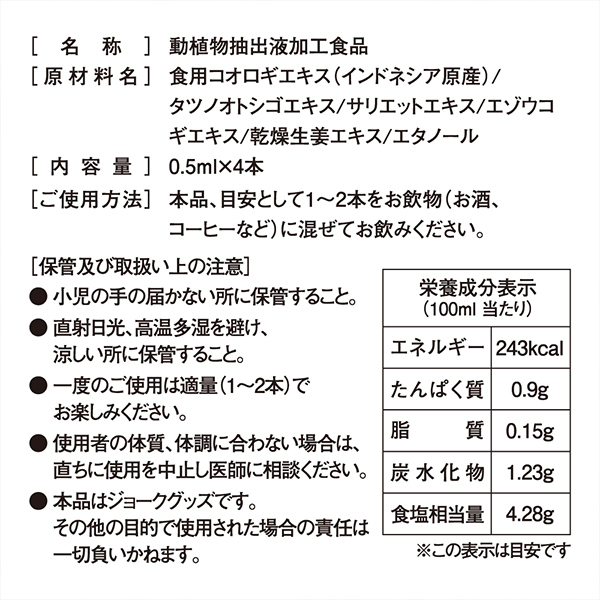 「内容量」0.5ml×4本。 「ご使用方法」本品、目安として1〜2本をお飲物(お酒、コーヒーなど)に混ぜてお飲みください。 ![]() --![]() 洪水 0.5ml×4本![]() パッケージ:7.0×5.5×1.5cm![]() [ BACK ]