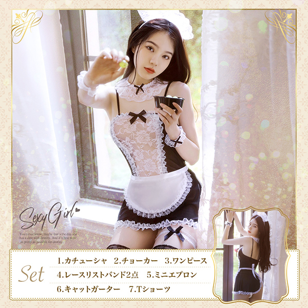 HOME > ランジェリー > その他 > コスプレ レース×リボン シアーメイド 7点セット ブラック×ホワイト