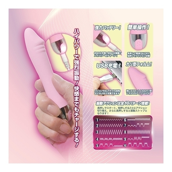 乾電池要らずの充電バッテリー仕様なので、乾電池では実現できない高出力の強烈振動が楽しめます!さらに、振動アクションは全10パターン搭載。 ボタンを押すごとにアクションが切り替わりますので、お好みの振動アクションを見付けましょう!さらに、チャージ方法はUSB方式なので、モバイルバッテリーやPCなど様々な環境で充電可能。 乾電池要らずなのでコスパも抜群です。 初めての方にもオススメできる、小ぶりサイズの太さ27ミリ。 軽くて持ちやすい、重さ52グラム。 すべすべと肌ざわり良い、マット表面加工。 充電時間90分で、約60分間の連続稼働します。 「ディック」モデルは、先端に亀●が付いたメンズ型フォルム。 返し形状デザインで独特の刺激を楽しめます。 パワーもエネルギーも快感もチャージする、最新鋭のスティックローター! ![]() --![]() ディック![]() パッケージ:18.0×5.0×3.0cm 本体:14.3×2.7×2.5cm 重量:52g USB充電式![]() [ BACK ]