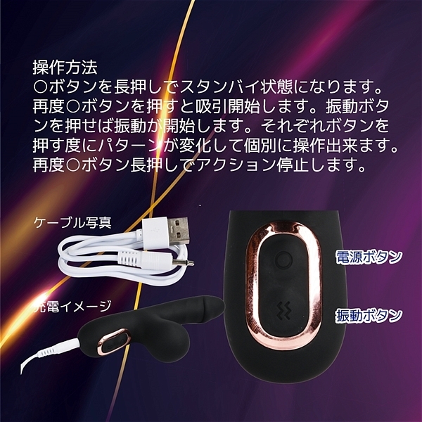 Gには絶妙な振動を生み出す上質のモーター。 何とも言えない快感の真空振動吸引機構を外責めに配置。 滑らかで肌心地の良いシリコン素材にしっかり洗えるIPX5の防水性能。 実用性の高い10パターン振動で自分に合わせて楽しめます。 60分充電で最大40分の使用が可能(使用環境により大幅に増減します。 )●HONEY ブラック ![]() ブラック![]() HONEY![]() パッケージ:15.5×7.8×3.3cm 本体:14.0×5.8×2.9cm 重量:88g USB充電式![]() [ BACK ]