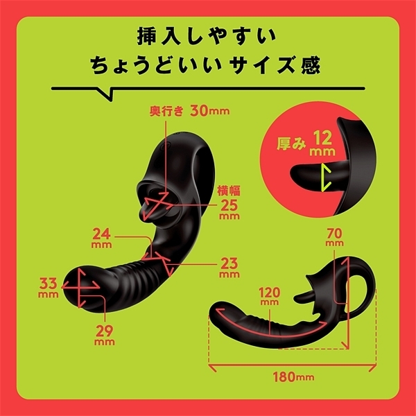 挿入長120mm、最大径33MMで挿入しやすいちょうどいいサイズ感になっています。 重量約170gで長時間使用しても疲れない軽量設計になっています。 マンネリしない多彩な100バリエーション!繊細タッチな微振動からパワフル振動まで豊富な10パターンのバイブ刺激!強く押し付けても痛くなりにくい柔らかい肉厚舌のとろけるクンニ10パターン!静音設計≦60db。 防水機能IPX6等級 ※IPX6:放水ノズルを使って噴流水を最低3分間あてる試験(浸水は不可) ![]() black![]() --