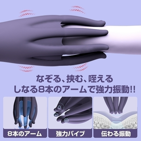 伝わる振動!!柔らかな医療用高品質なシリコンを採用。 8本のアームが中心部の強振動バイブレーションを伝って躍動します。 弱強振動、リズム振動をワンボタンで操作。 全10モードをお楽しみいただけます。 カップルでもセルフプレイでも楽しめるユニセックスプレジャーアイテム。 <内容物>本体、USB充電器<充電時間>1時間<可動時間>2時間 ![]() --![]() --