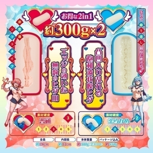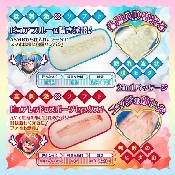 ![]() 個性的な設計が特徴の非貫通型ホール2本セットです♪ピュアブルーとピュアレッドの2種類がセットになっており、異なる感触を楽しめます!ピュアブルーは柔らかめの弾力で、波状ヒダと突起が絡み合う構造♪じっくりとリラックスした時間を過ごしたい方におすすめです!一方、ピュアレッドは縦ヒダ構造で高刺激を提供し、アクティブな使用感を求める方に適しています!どちらも柔らかめの素材で心地よい使用感を実現しています♪COOLP初の1箱2本入りパッケージで、シーンに応じて使い分けることが可能です!ユニークな設計で、自宅でのリラックスタイムに彩りを添える特別なアイテムです♪