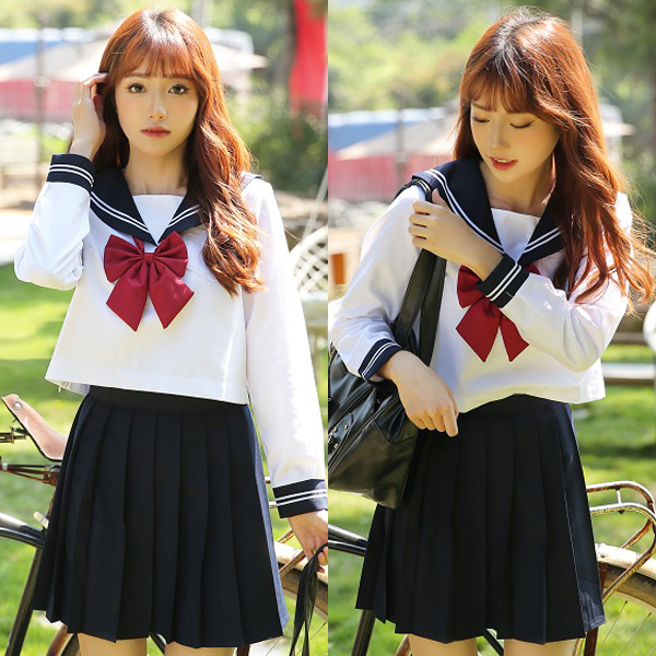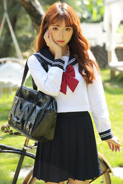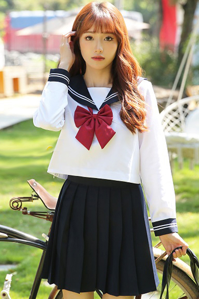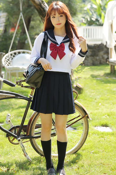 ![]() 清潔感溢れる紺と白の制服を、真っ赤な大きいスクールリボンで華やかに魅せた長袖仕様のセーラー服。
