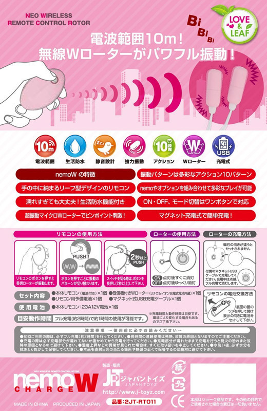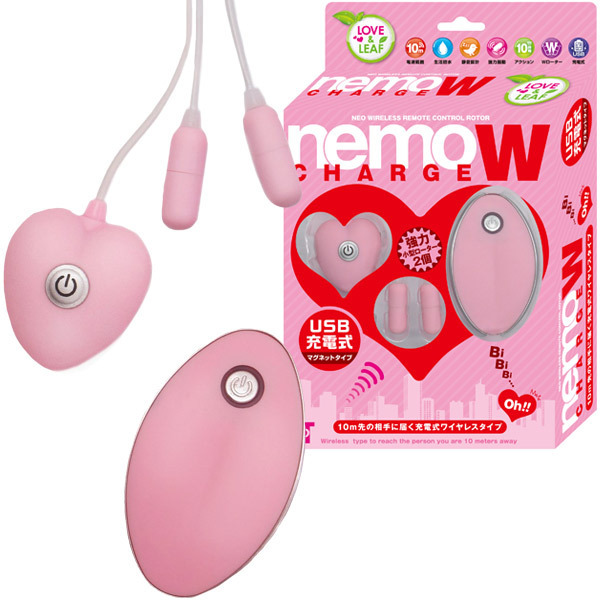 ●肌触りの良いピンクマット加工●手に馴染むリーフ型リモコン●ハート型の受信機付きツインローター●受信の最大距離は約10m●小型でも強力な10パターンの振動搭載●ワンボタンでON・OFF・振動切替可●便利なマグネット式USB充電ケーブル付属●約2時間のフル充電で約1時間稼動(受信機)●ローター部分のみ水洗い可。 強力ワイヤレスの遠隔ローターシリーズ「nemo」に、ピンポイントで当てやすい小型のツインロータータイプが登場!両乳首やクリ&膣の同時責めなど、幅広いプレイスタイルに対応可能です。 受信機は振動時以外も電波受信の為に電池を消費しますので、使用後は必ず電源をOFFにしてください。 ※付属電池は動作確認用です。 ![]() ピンク![]() --