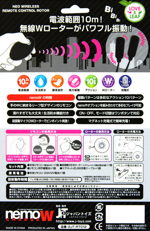 ![]() パッケージ:18.0×12.0×3.7cm 本体:ローター8.0×2.3cm リモコン6.6×4.0×2.0cm 電池:受信ローター USB充電式、送信リモコン 23A12V電池×1本使用(予備電池1本付属)![]() [ BACK ]